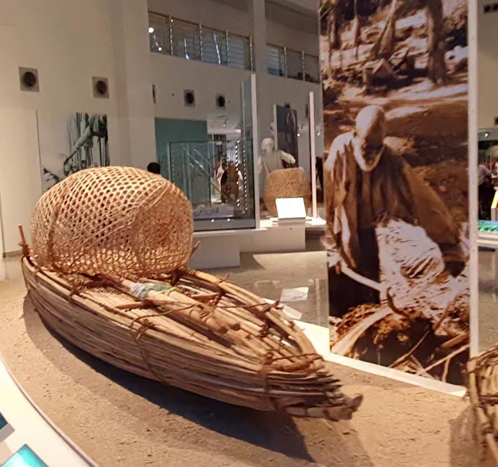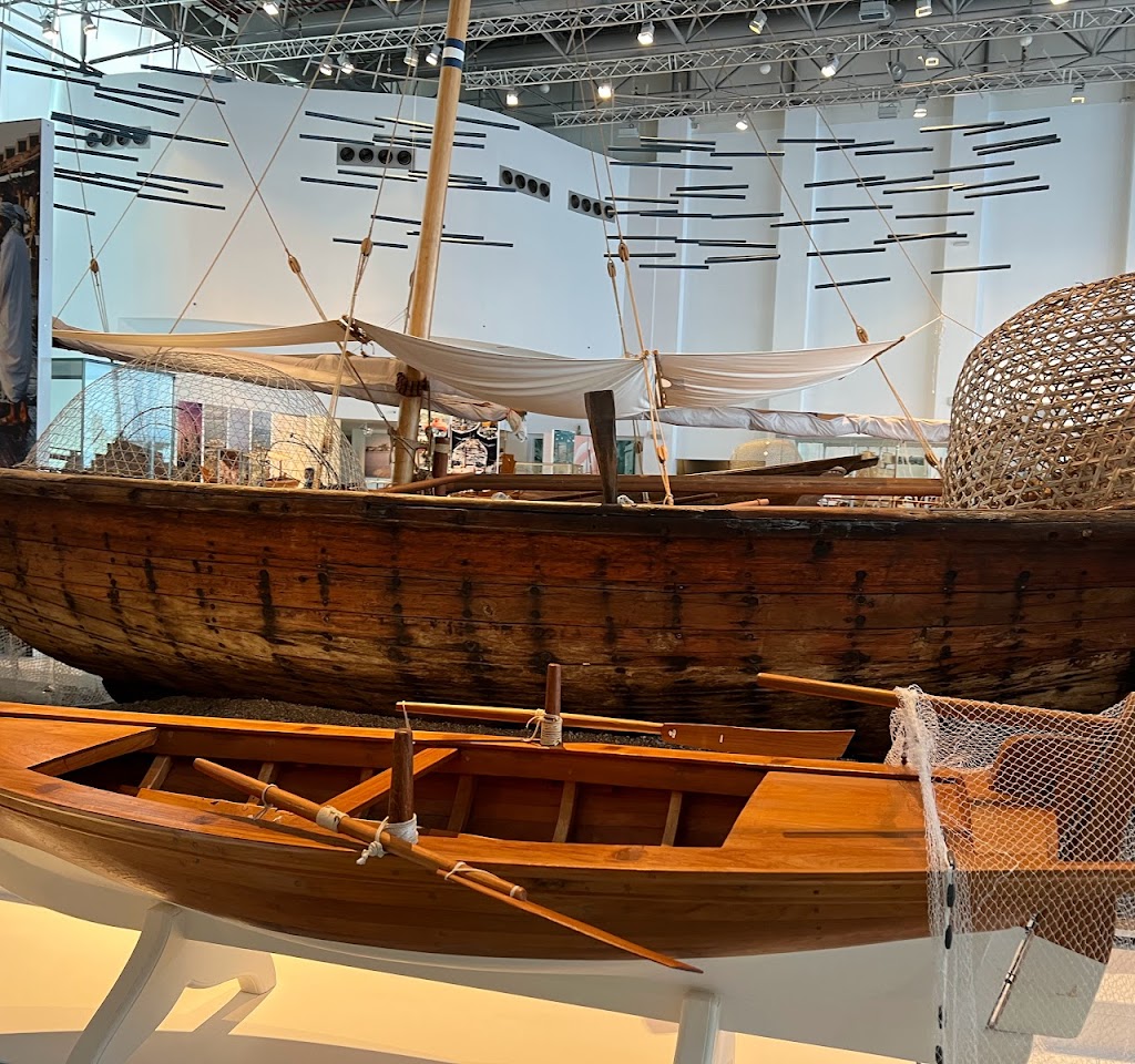 Modern space with exhibits on maritime trade & marine life, such as maps, ancient boats & artifacts.